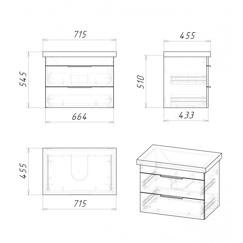Тумба снабжена двумя ящиками, которые укомплектованы направляющими плавного закрывания, ящики предназначены для хранения различных предметов. Тумба выполнена из влагостойкого ЛДСП, устойчивый к перепадам температур и высокой влажности, крепится к стене и не занимает место на полу. Ручки и подвесы для крепления тумбы - в комплекте.