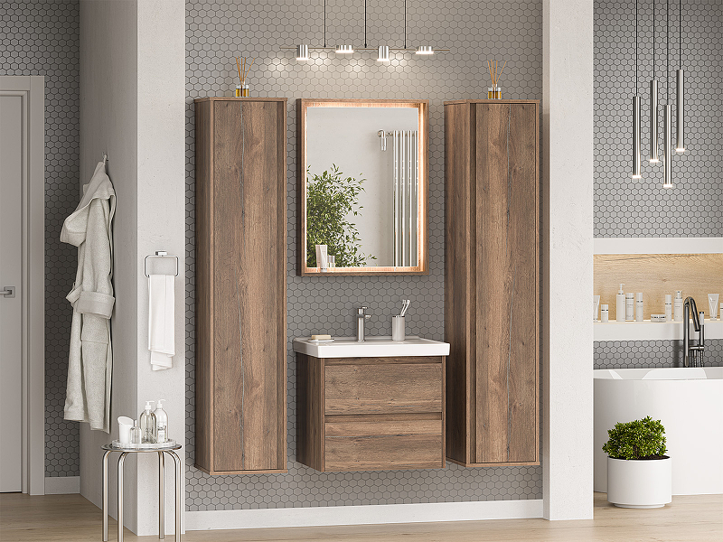 Мебель из коллекции Dallas имеет продуманную конструкцию: отсутствие внешней фурнитуры, а также современный и эффектный внешний вид, благодаря имитации под дуб с ярко выраженной структурой волокон. Также, тумбы оснащены двумя выдвижными ящиками с доводчиками, где верхний ящик разделён на несколько отсеков, для удобного и компактного хранения ванных принадлежностей.