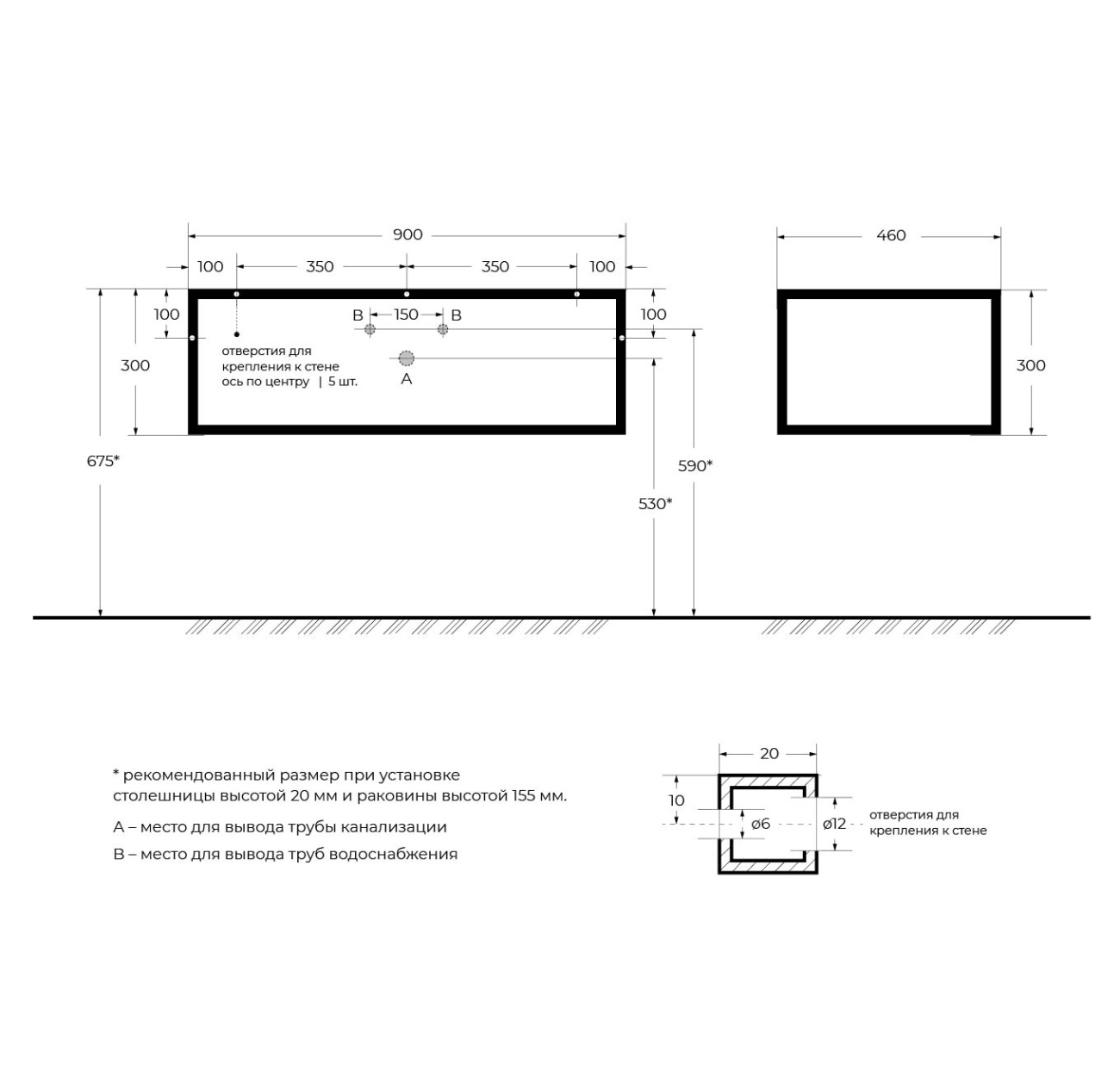 Столешница из керамогранита 90x46x2 см (3 цвета) с отверстием или без