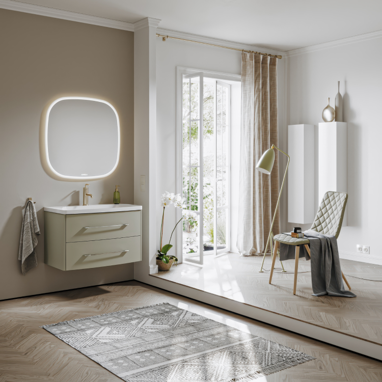 Универсальное зеркало Aura с футуристичной формой скругленного квадрата подчеркивает лаконичность тумб Neringa. Мягкая регулируемая подсветка по периметру с системой антизапотевания и бесконтактным выключателем позволит с комфортом проводить время в ванной комнате.