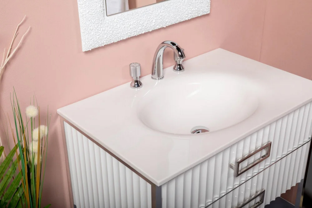 Клиент может выбрать столешницу из мрамора, хрустального каленого стекла в различных цветовых исполнениях, и Solid Glass (передовой материал, в состав которого входит мраморная крошка и стекло).