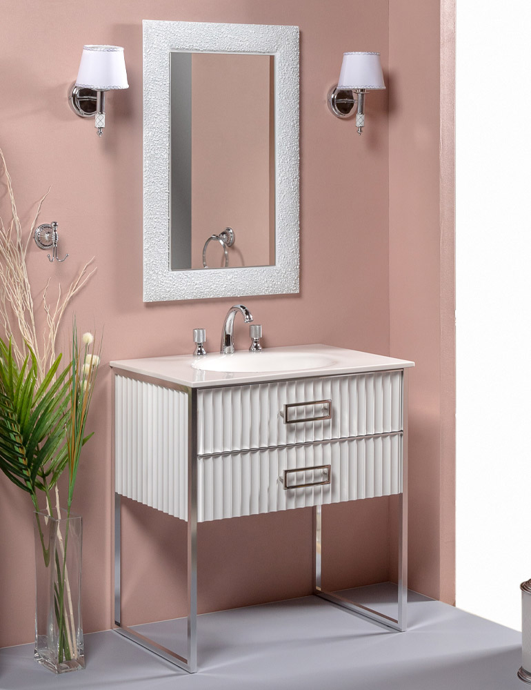 Алюминиевые ножки и ручки возможны в цветах золото и хром. Размерный ряд коллекции Monaco состоит из 80 см, 100 см и 160 см (на 2 чаши-раковины).