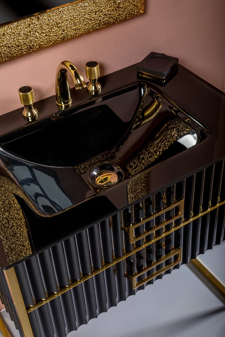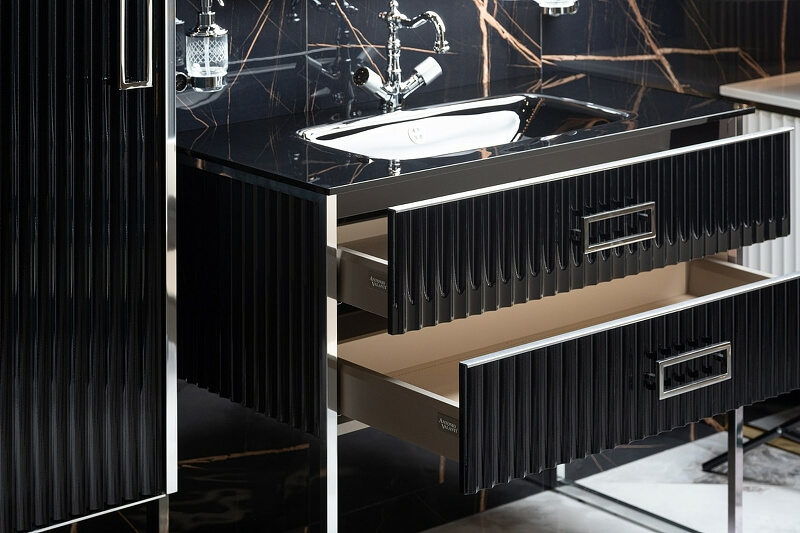 Алюминиевые ножки и ручки возможны в цветах золото и хром. Размерный ряд коллекции Monaco состоит из 80 см, 100 см и 160 см (на 2 чаши-раковины).