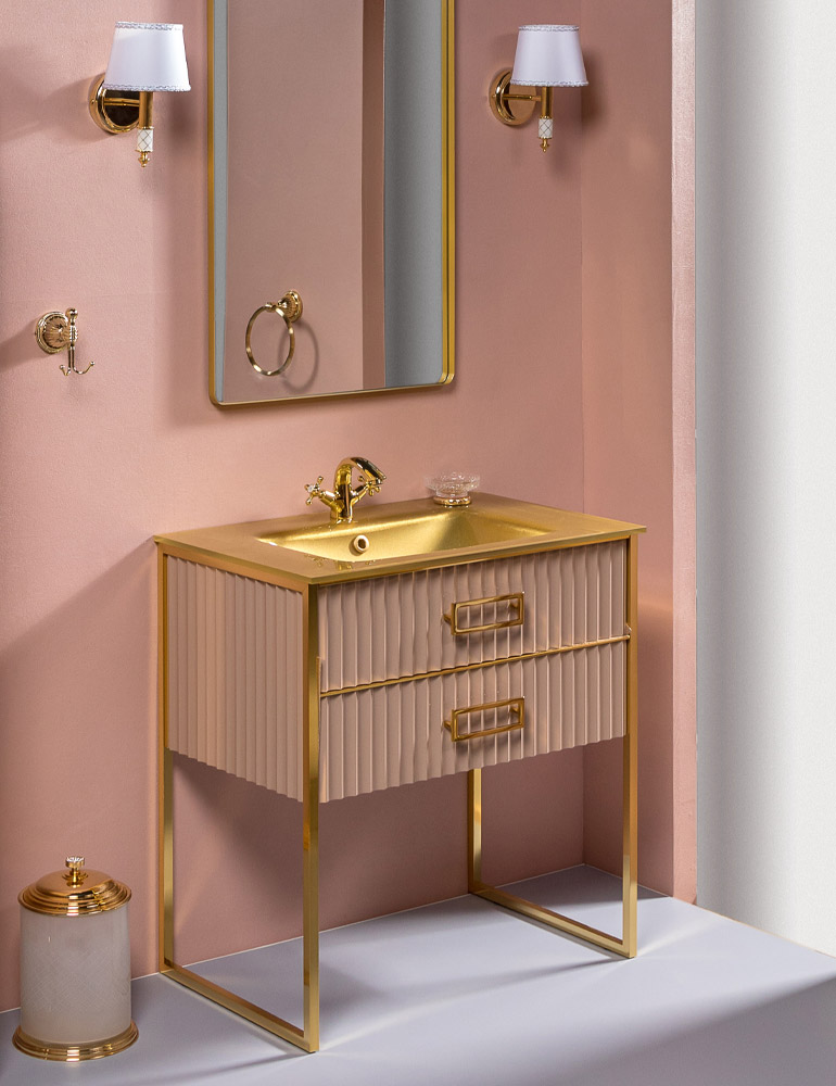 Алюминиевые ножки и ручки возможны в цветах золото и хром. Размерный ряд коллекции Monaco состоит из 80 см, 100 см и 160 см (на 2 чаши-раковины).