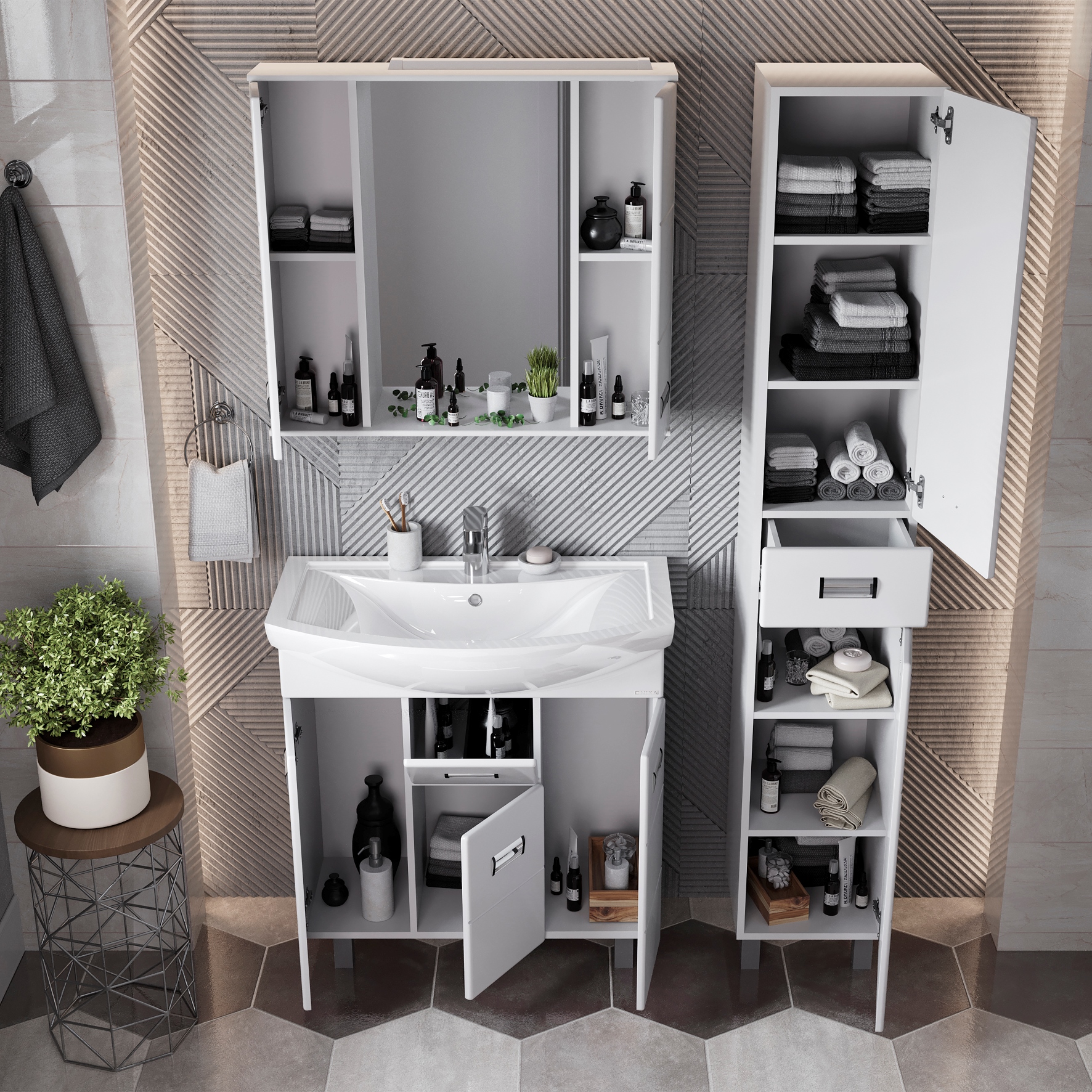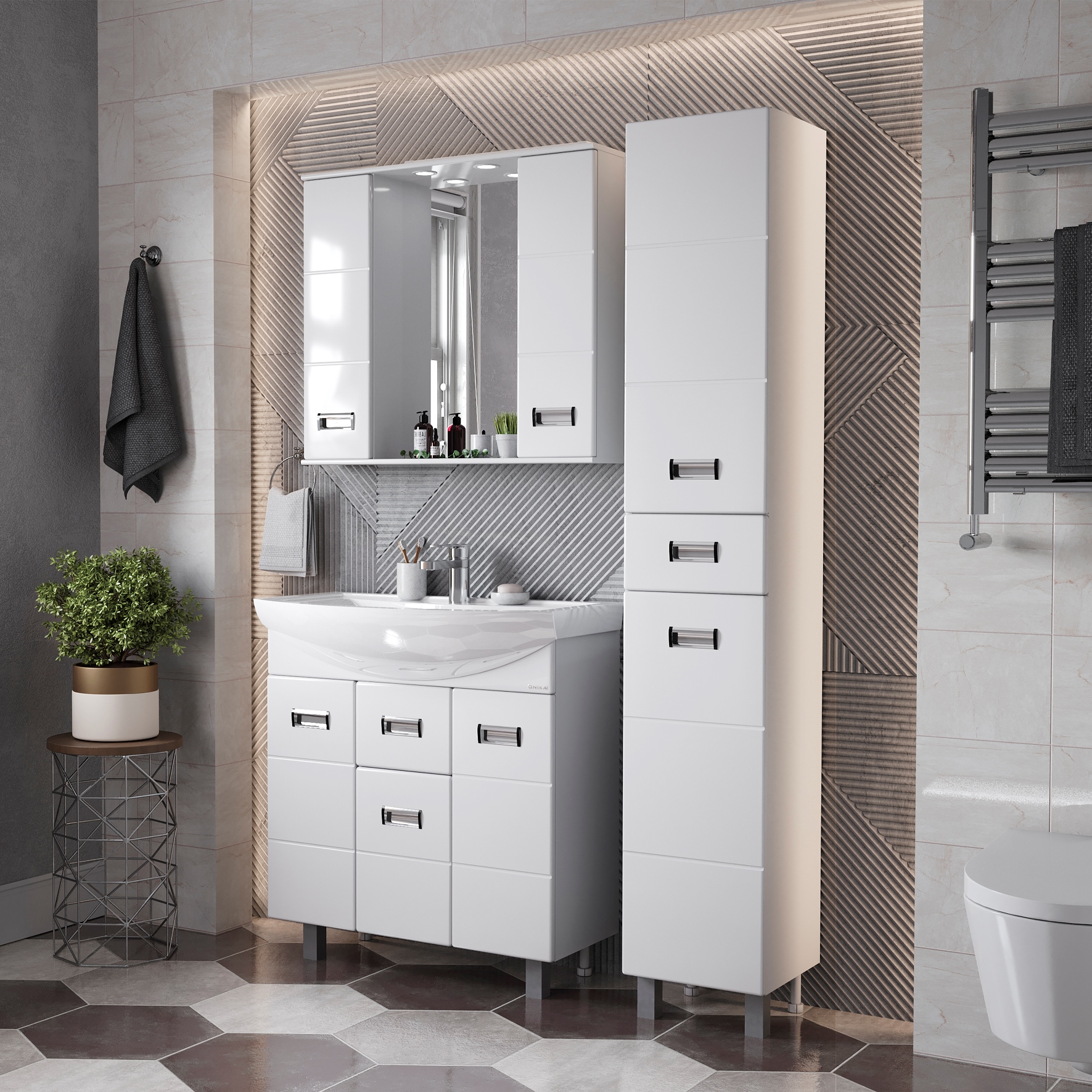 Напольная тумба для ванной комнаты Onika Балтика 80 - это простые функциональные формы и яркий акцент в любом дизайне. Глянцевый белый цвет фасада, ненавязчивая горизонтальная фрезеровка, врезные хромированные ручки и аккуратная лаконичность - все это позволяет коллекции Балтика стать центральным звеном интерьера ванной комнаты. За тремя распашными дверцами с системой плавного закрывания расположено вместительное отделение для хранения, разделенное на части горизонтальными полками, а маленькая откидная дверца по центру тумбы обеспечивает доступ к коммуникациям. Корпус тумбы выполнен из ЛДСП, фасад - из ЛМДФ в пленке, устойчивых к механическим воздействиям, перепадам температур и высокой влажности. 2 декоративных и 2 пластиковых ножки с регулировкой по высоте идут в комплекте с тумбой.