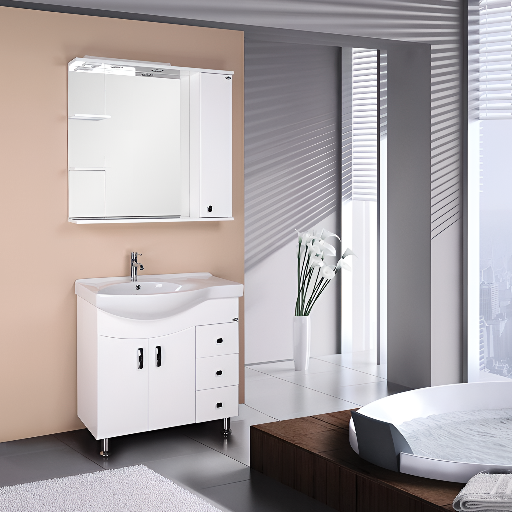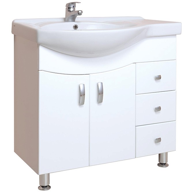 В тумбе Onika Эльбрус 82 белоснежный глянец фасада подчеркивается оригинальной хромированной фурнитурой и сложной изысканной геометрией линий. Современный функционал тумбы позволяет удобно расположить все необходимое: две распашных двери слева скрывают большое отделение для крупных предметов, а три выдвижных ящика справа созданы для хранения небольших вещей. Ящики тумбы оснащены направляющими полного выдвижения, а дверцы снабжены системой плавного закрывания. Корпус тумбы выполнен из ЛДСП, фасад - из ЛМДФ в пленке, устойчивых к механическим воздействиям, перепадам температур и высокой влажности. Пять хромированных ручек и четыре ножки (2 декоративных хромированных и 2 пластиковых) идут в комплекте с тумбой.