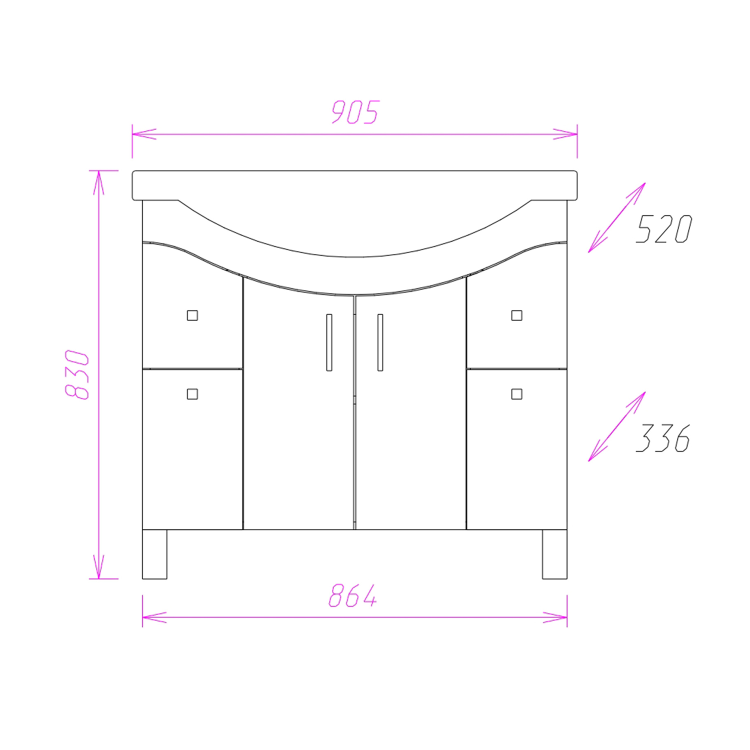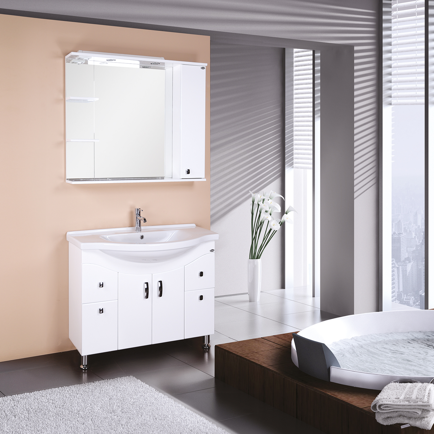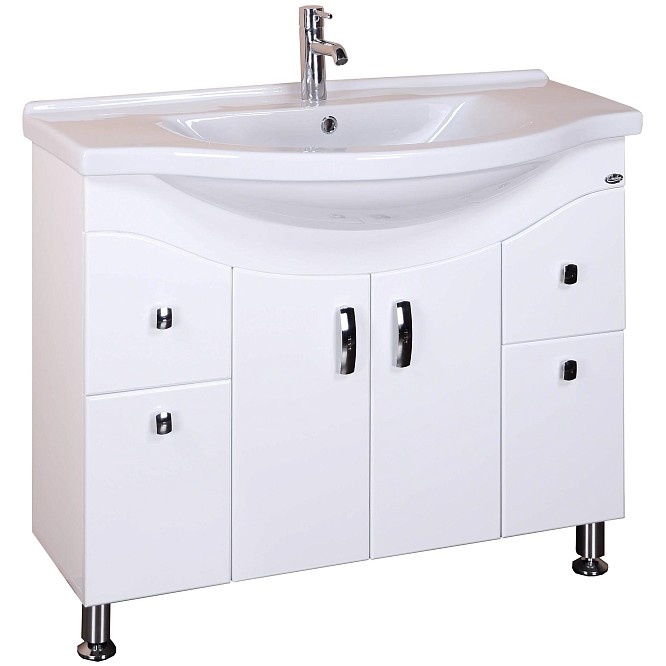 В тумбе Onika Эльбрус 90 белоснежный глянец фасада подчеркивается оригинальной хромированной фурнитурой и сложной изысканной геометрией линий. Современный функционал и огромное внутреннее пространство тумбы позволяет удобно расположить все необходимое: по центру тумбы 2 распашных двери скрывают большое отделение для крупных предметов, а по бокам 2 ниши за распашными дверцами и 2 выдвижных ящика созданы для хранения небольших вещей. Ящики тумбы оснащены направляющими полного выдвижения, а дверцы снабжены системой плавного закрывания. Корпус тумбы выполнен из ЛДСП, фасад - из ЛМДФ в пленке, устойчивых к механическим воздействиям, перепадам температур и высокой влажности. Шесть хромированных ручек и пять ножек (2 декоративных хромированных и 3 пластиковых) идут в комплекте с тумбой