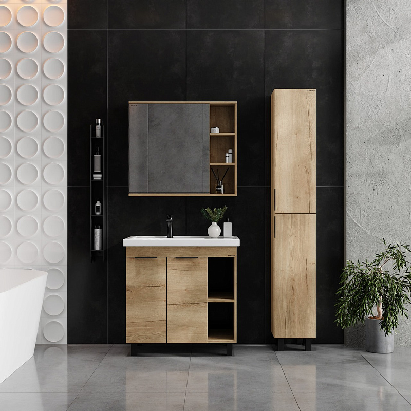 Напольная тумба под раковину для ванной комнаты Onika Легран 80 - это сочетание насыщенного древесного декора и благородства металла: роскошная текстура и натуральный цвет дуба дают теплоту, а черная матовая фурнитура добавляют урбанизма и солидности. За распашными дверцами с доводчиками расположено вместительное отделение, разделенное на две части горизонтальной полочкой. Две открытые полки справа от дверей служат дополнительным пространством для хранения. Тумба для ванной выполнена из ЛДСП, устойчивой к механическим воздействиям, перепадам температур и высокой влажности. 2 металлические ручки и 4 ножки (2 декоративных и 2 пластиковых) с регулировкой по высоте идут в комплекте с тумбой для ванны. Размеры тумбы в ванную без учета раковины и ножек 77x43x68 см. Гарантия на изделие 2 года. Совместимая раковина - Kirovit Фостер 80 крыло справа. Тумба для раковины Onika - это изысканность и утончённая роскошь в интерьере. Тумба под ванную станет удобным местом для хранения необходимых принадлежностей. Материал тумбы в ванну - ЛДСП - экологически чистый, обладающий высокой жесткостью и прочностью, что гарантирует долговечность вашей мебели.