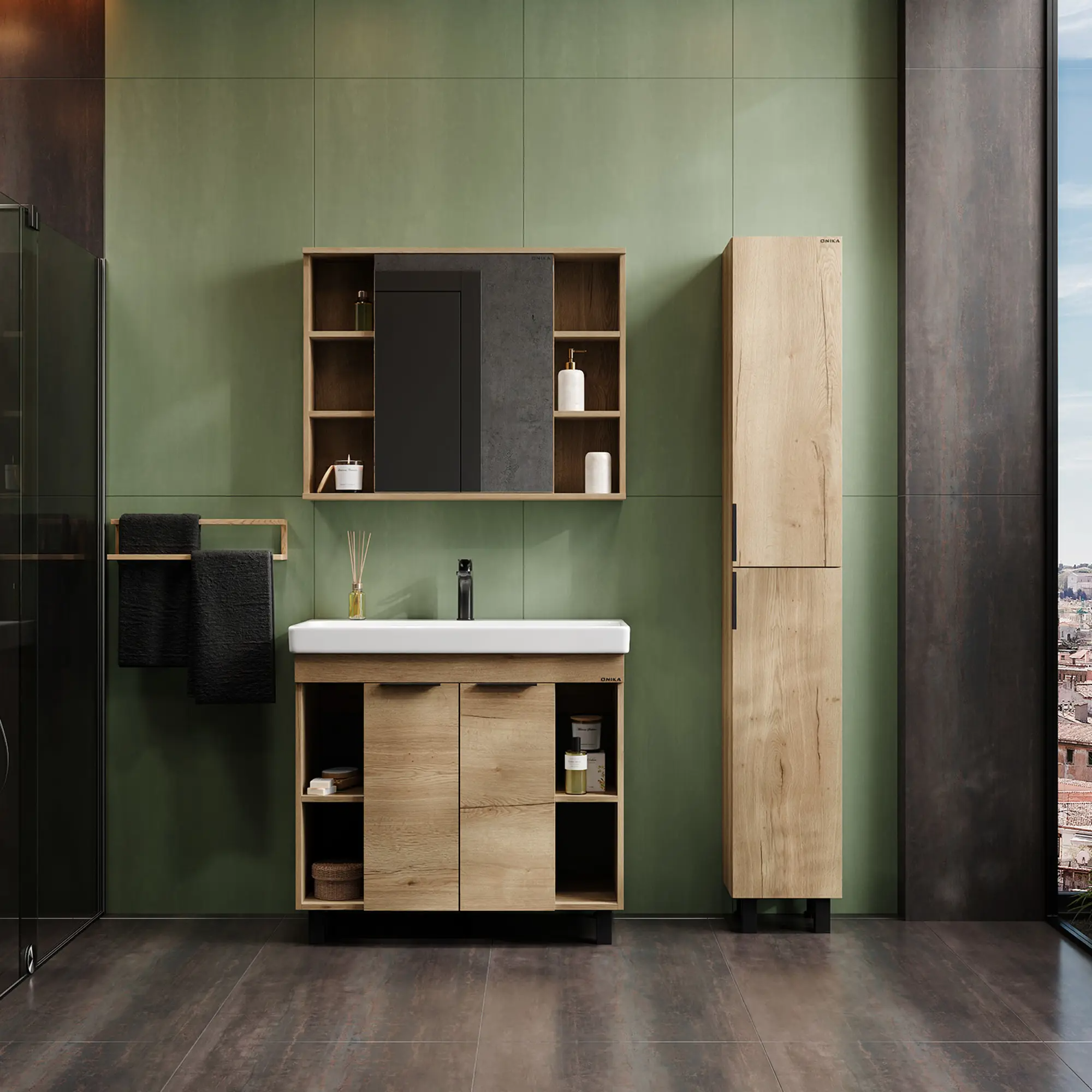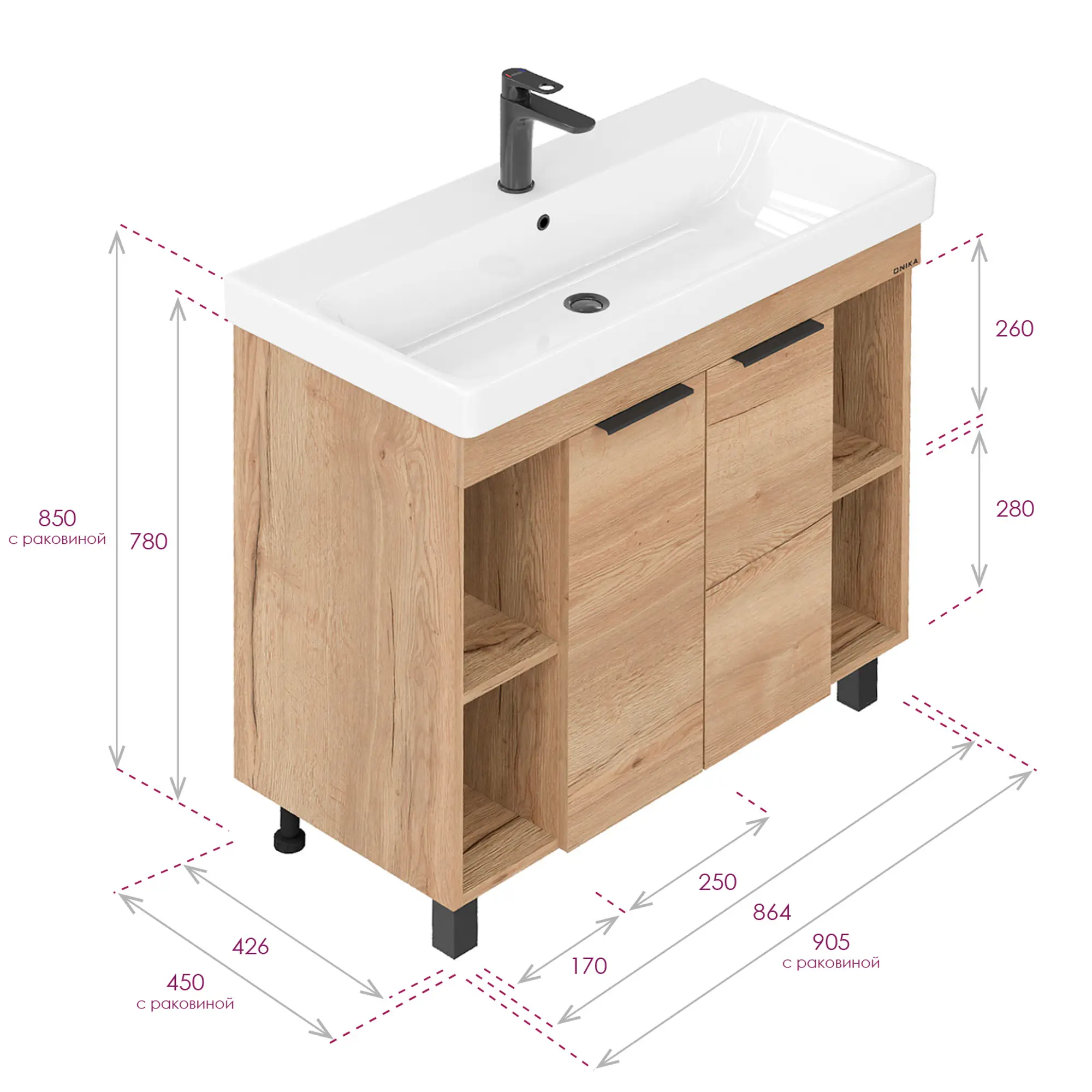 Напольная тумба под раковину для ванной комнаты Onika Легран 90 - это сочетание насыщенного древесного декора и благородства металла: роскошная текстура и натуральный цвет дуба дают теплоту, а черная матовая фурнитура добавляют урбанизма и солидности. За распашными дверцами с доводчиками расположено вместительное отделение, разделенное на две части горизонтальной полочкой. Открытые полки по бокам служат дополнительным пространством для хранения. Тумба для ванной выполнена из ЛДСП, устойчивой к механическим воздействиям, перепадам температур и высокой влажности. 2 металлические ручки и 4 ножки (2 декоративных и 2 пластиковых) с регулировкой по высоте идут в комплекте с тумбой для ванны. Совместимая раковина - Santek Адриана 90. Тумба для раковины Onika - это изысканность и утончённая роскошь в интерьере. Тумба под ванную станет удобным местом для хранения необходимых принадлежностей. Материал тумбы в ванну - ЛДСП - экологически чистый, обладающий высокой жесткостью и прочностью, что гарантирует долговечность вашей мебели.