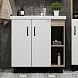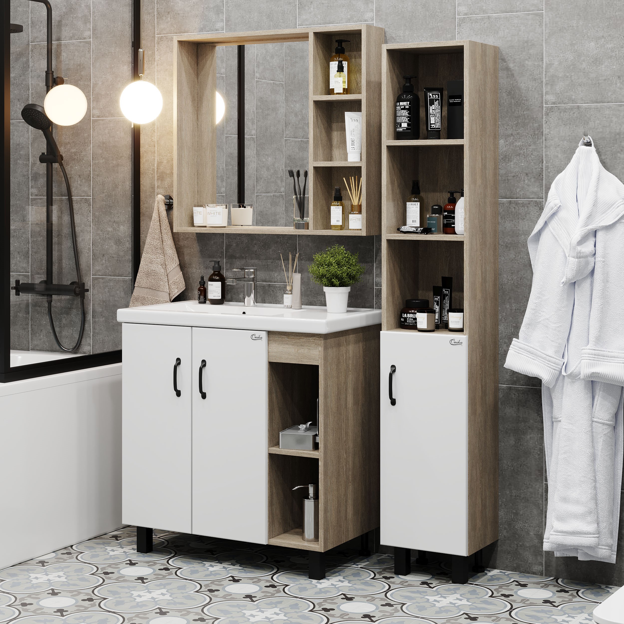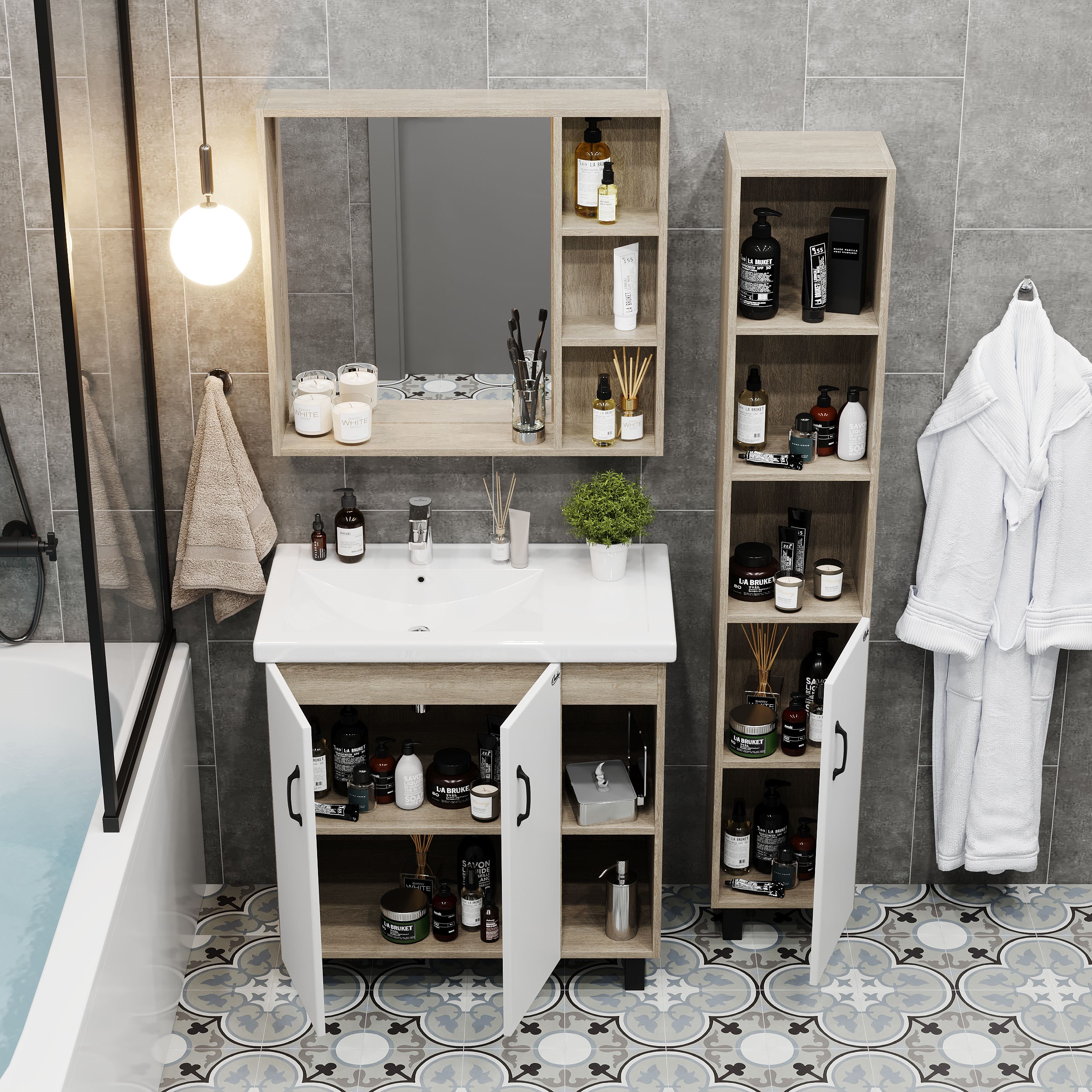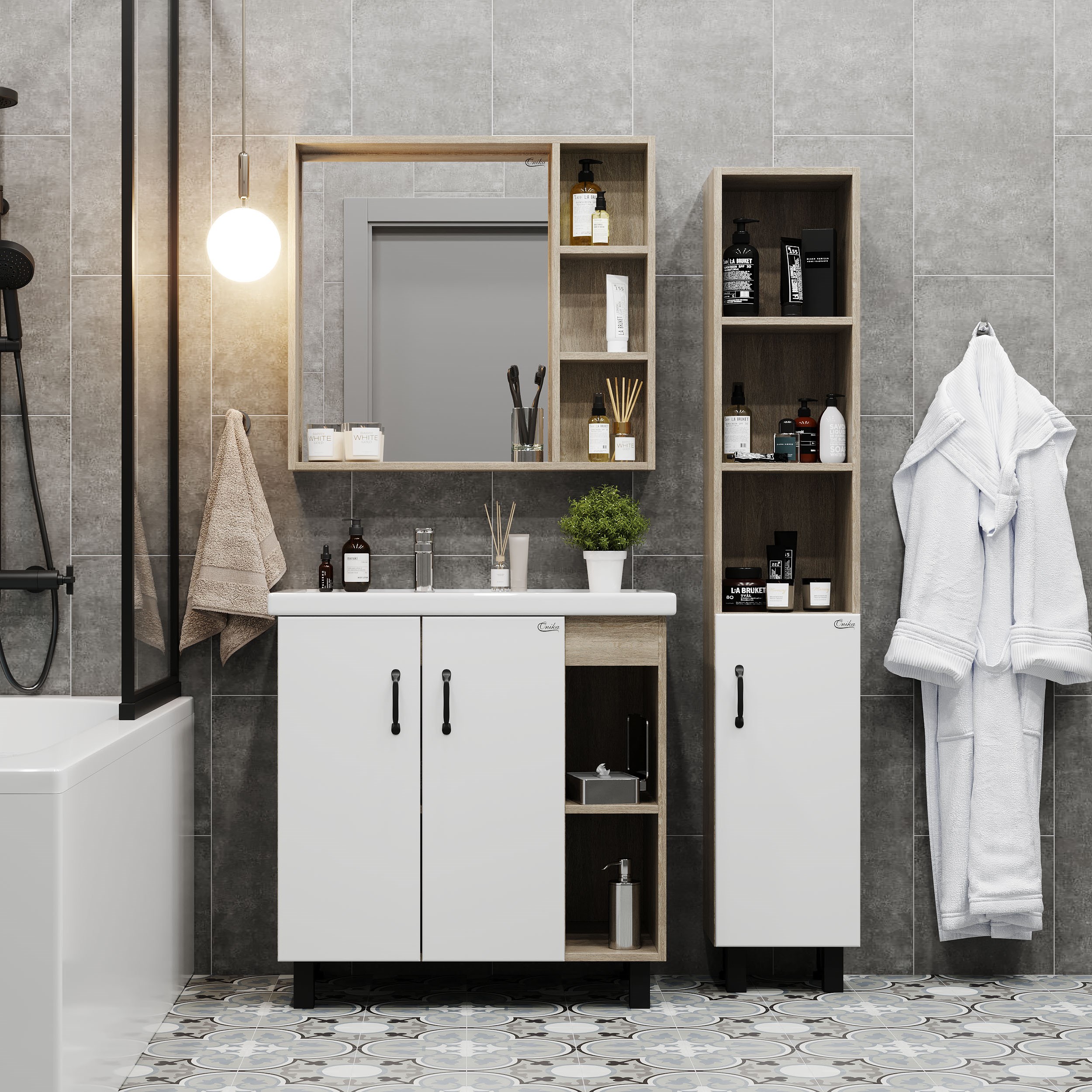 В тумбе Onika Тимбер 80 удачно сочетаются контрастные цвета и фактуры: белый матовый фасад с покрытием SoftTouch, корпус цвета дуба с роскошной текстурой, черная матовая металлическая фурнитура. Открытые полки справа обеспечивают быстрый доступ к часто используемым аксессуарам, а пространство за распашными дверцами слева, снабженными системой плавного закрывания, станет удобным местом для хранения различных бытовых принадлежностей. Корпус тумбы выполнен из ЛДСП, фасад - из ЛМДФ в пленке, устойчивых к механическим воздействиям, перепадам температур и высокой влажности. 2 черных металлических ручки и 4 ножки (2 декоративных черных и 2 пластиковых) идут в комплекте с тумбой.