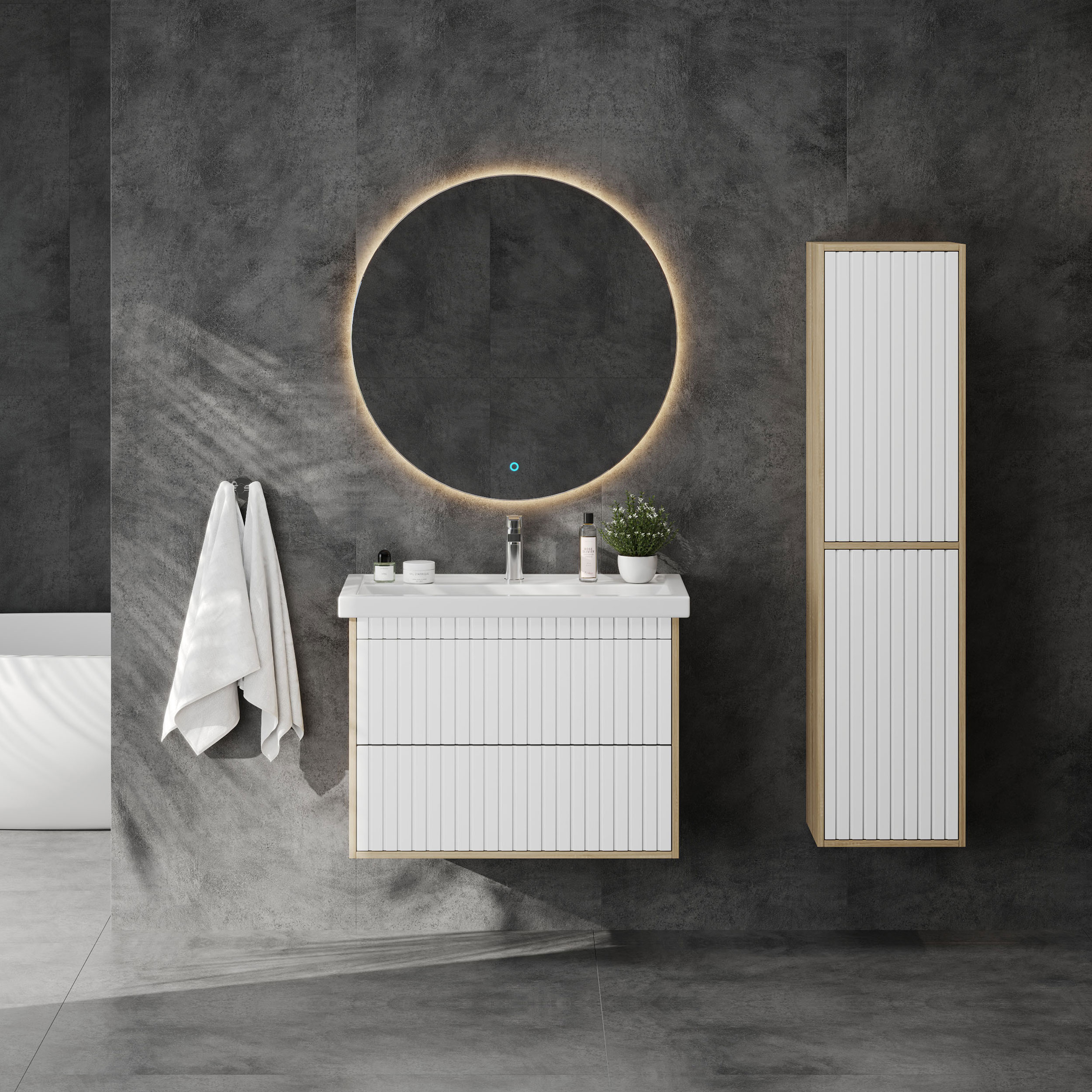 Рифленый белый матовый фасад с покрытием SoftTouch и корпус цвета дуба с роскошной текстурой подчеркнет изысканный вкус владельца и станет центральным элементом декора.