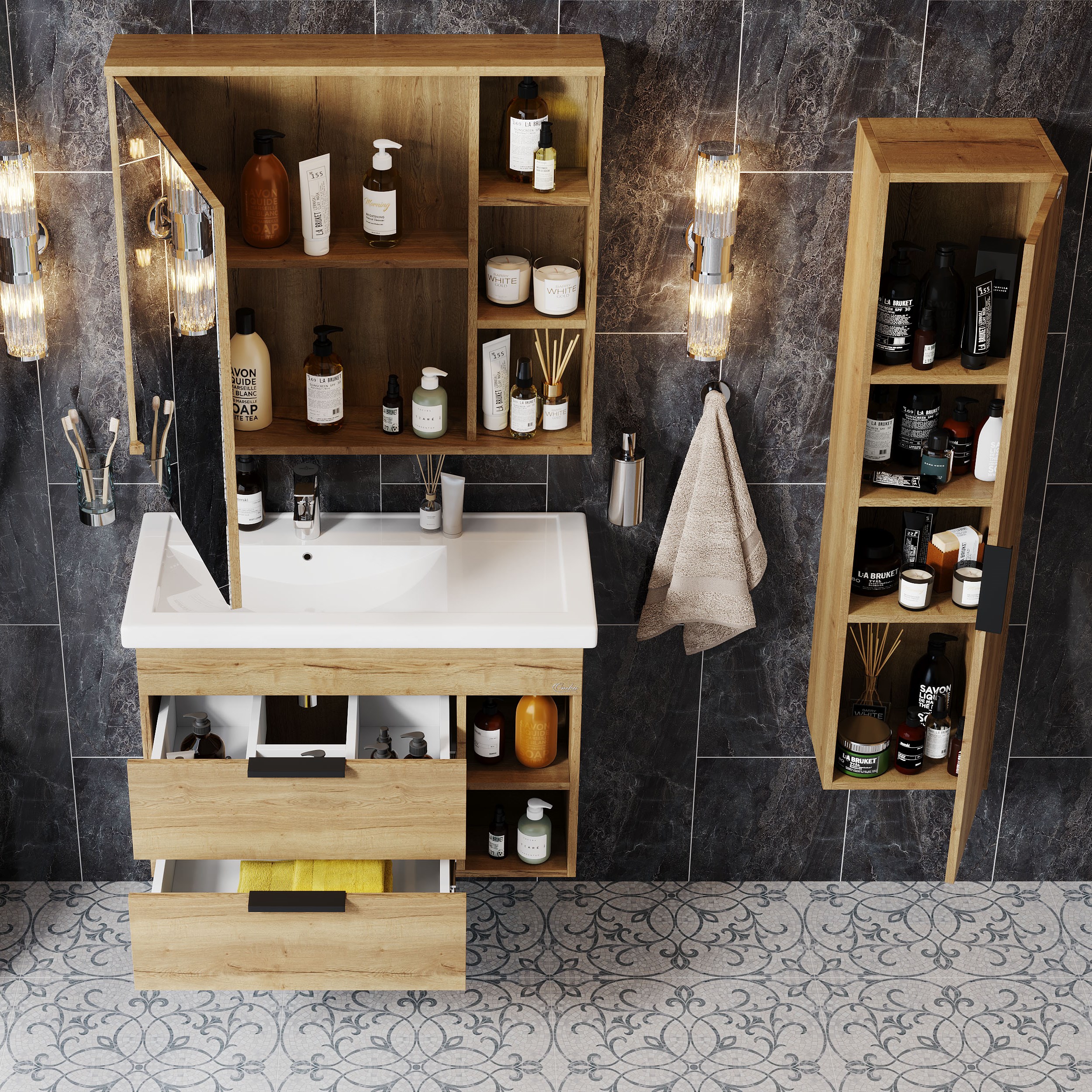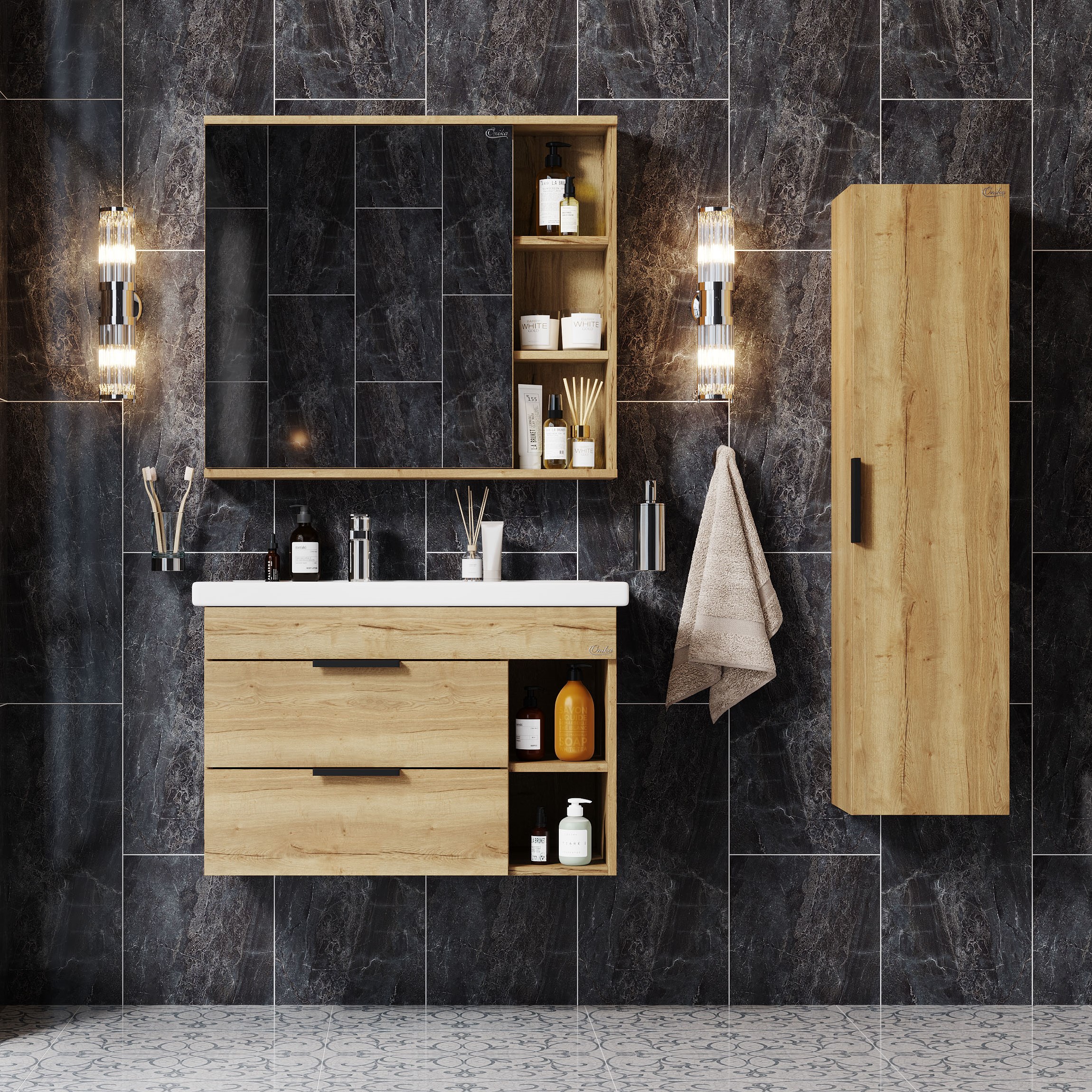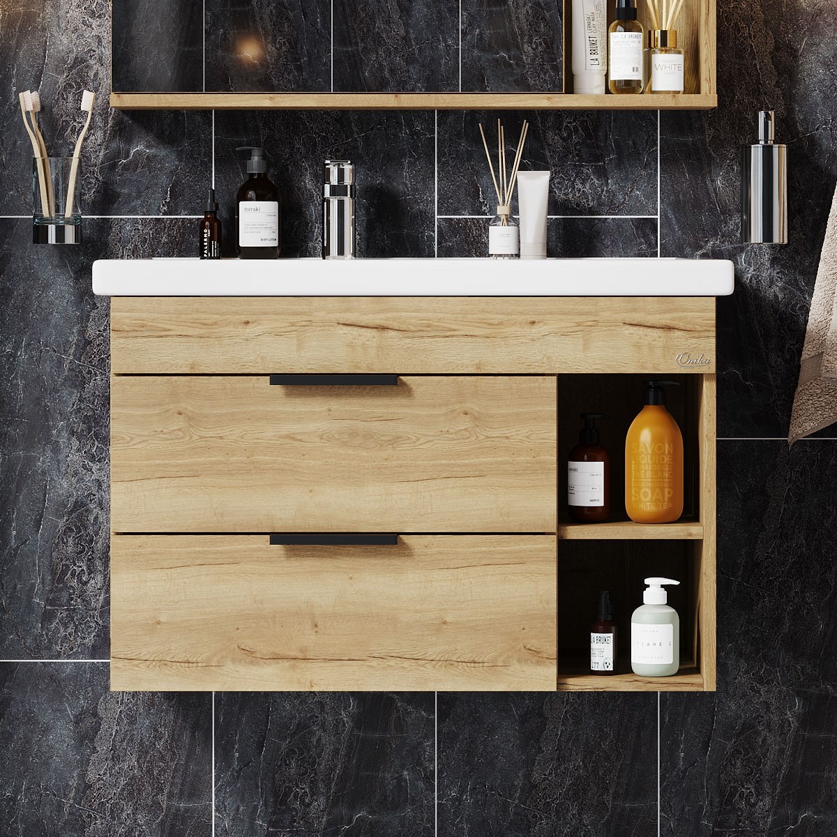 Подвесная тумба для ванной комнаты Onika Легран 80 - это сочетание насыщенного древесного декора и благородства металла: роскошная текстура и натуральный цвет дуба дают теплоту, а матовые металлические ручки добавляют урбанизма и солидности. Тумба имеет два ящика, снабженные системой плавного закрывания. Нижний предназначен для больших предметов, а верхний, имеющий удобную систему организации пространства, - для мелких аксессуаров. Две открытые полки справа от ящиков служат дополнительным пространством для хранения. Тумба выполнена из ЛДСП, устойчивой к механическим воздействиям, перепадам температур и высокой влажности, при этом она надежно крепится к стене и не занимает место на полу, не создавая при этом сложностей в уборке помещения. Ручки и подвесы для крепления тумбы - в комплекте.