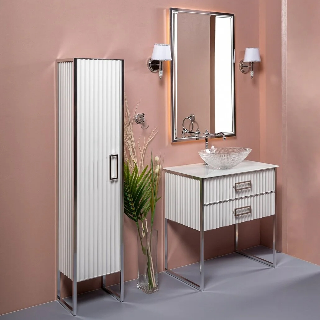 Алюминиевые ножки и ручки возможны в цветах золото и хром. Размерный ряд коллекции Monaco состоит из 80 см, 100 см и 160 см (на 2 чаши-раковины).