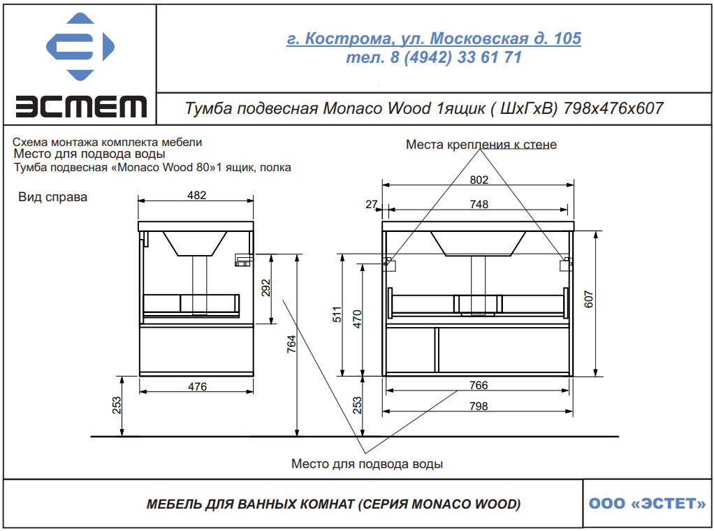 Тумба с раковиной Эстет Monaco Wood 80 см 1ящ+ниша ФР-00010683