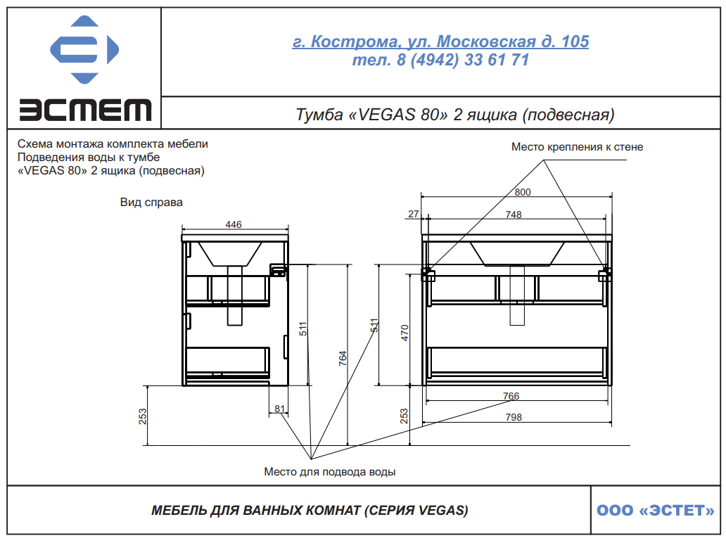Тумба с раковиной Эстет Vegas 80 см ФР-00003491
