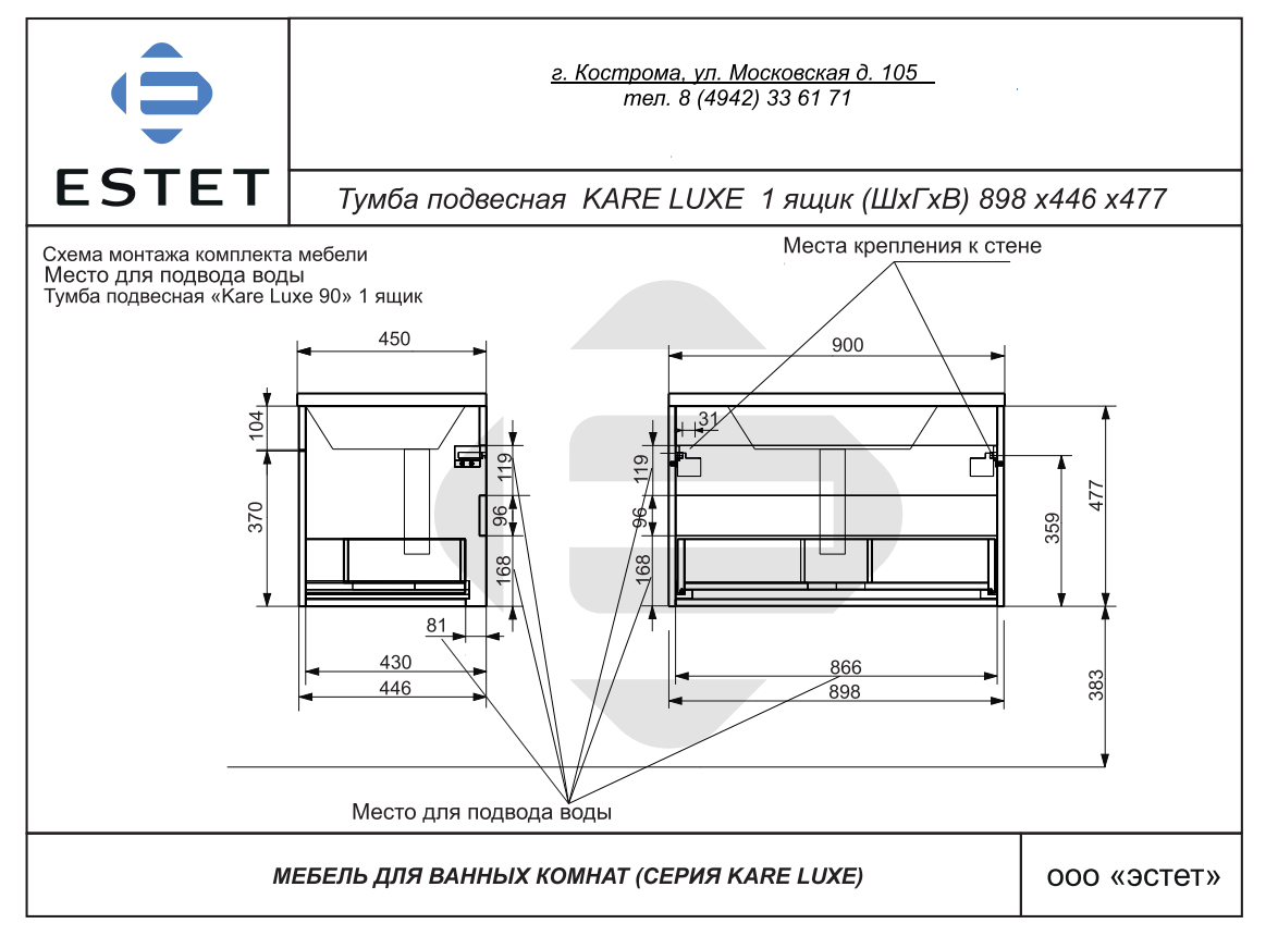 Тумба с раковиной подвесная Эстет Kare Luxe 90 см 1ящ ФР-00015245