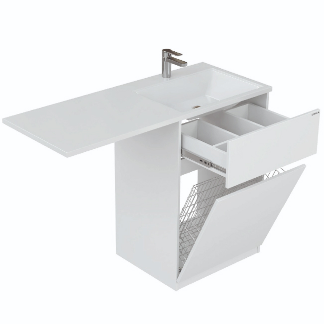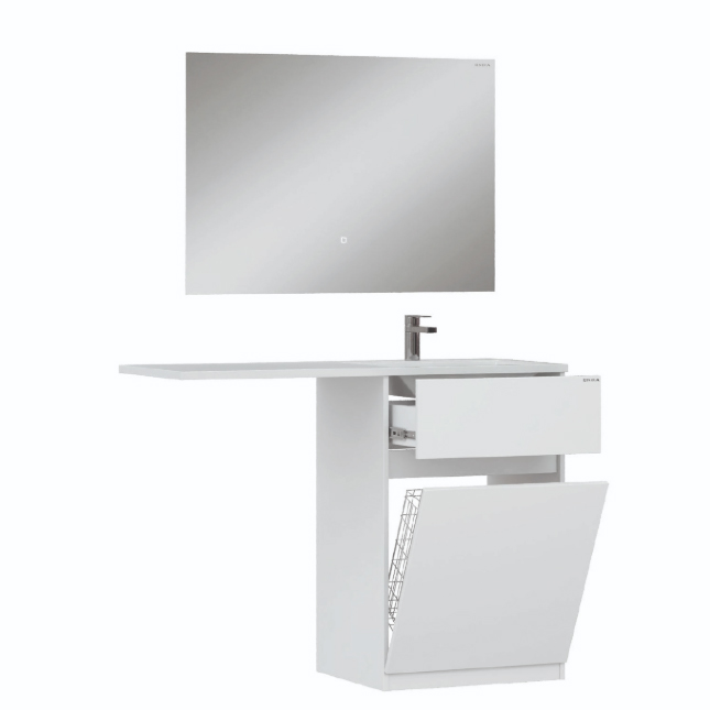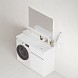 Тумба имеет белый глянцевый фасад, строгие формы без декора, удобные интегрированные ручки и оптимальное содержание: выдвижной ящик для необходимых мелочей и две корзины для белья за откидной дверцей.