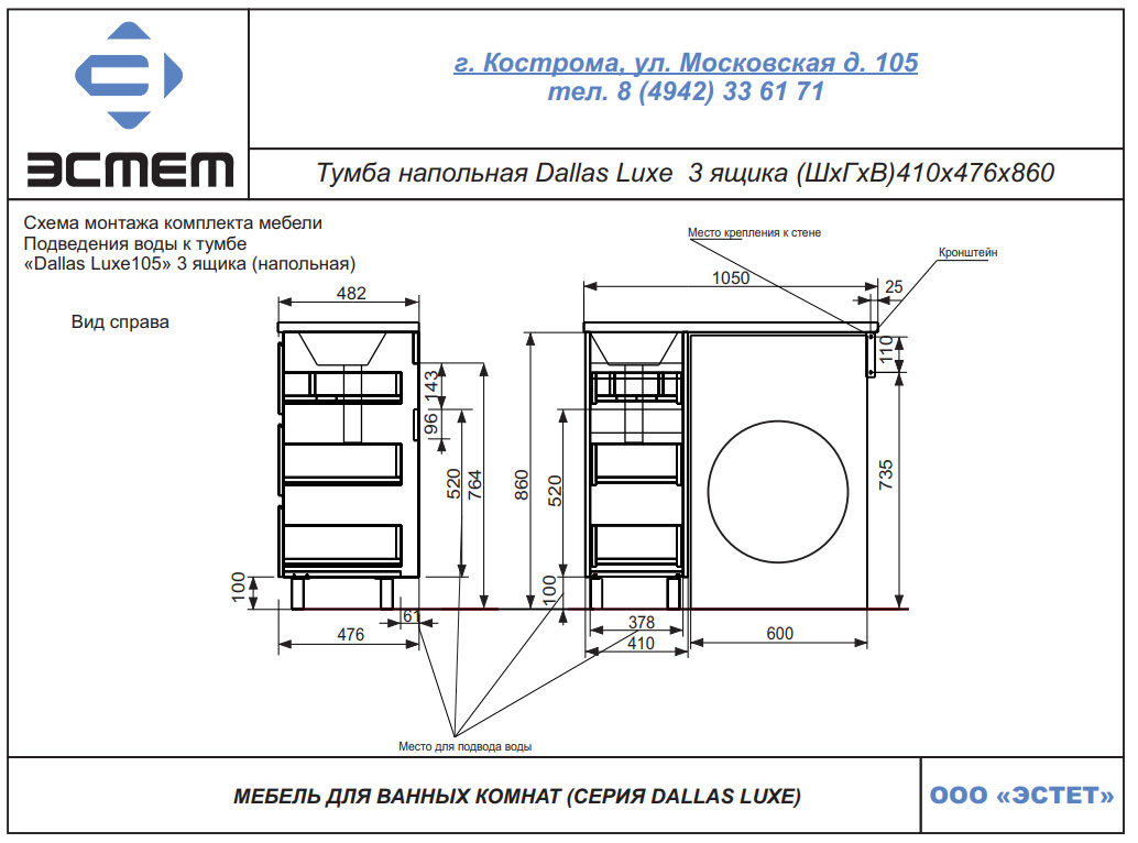 | Раковина | Литьевой мрамор 105 L/R, кронштейн приобретается отдельно |
