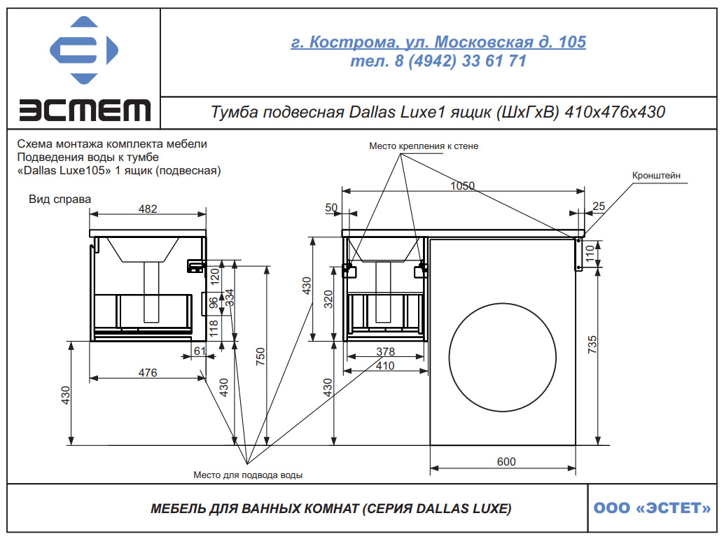 Тумба подвесная с раковиной Эстет Даллас Люкс 105 см (1 ящик) ФР-00009675/ ФР-00009674