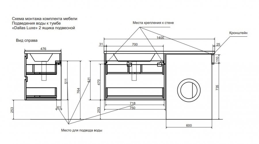 | Раковина | Литьевой мрамор 140 L/R, кронштейн приобретается отдельно |