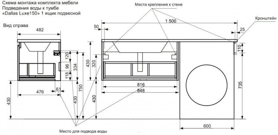 | Раковина | Литьевой мрамор 150 L/R, кронштейн приобретается отдельно |