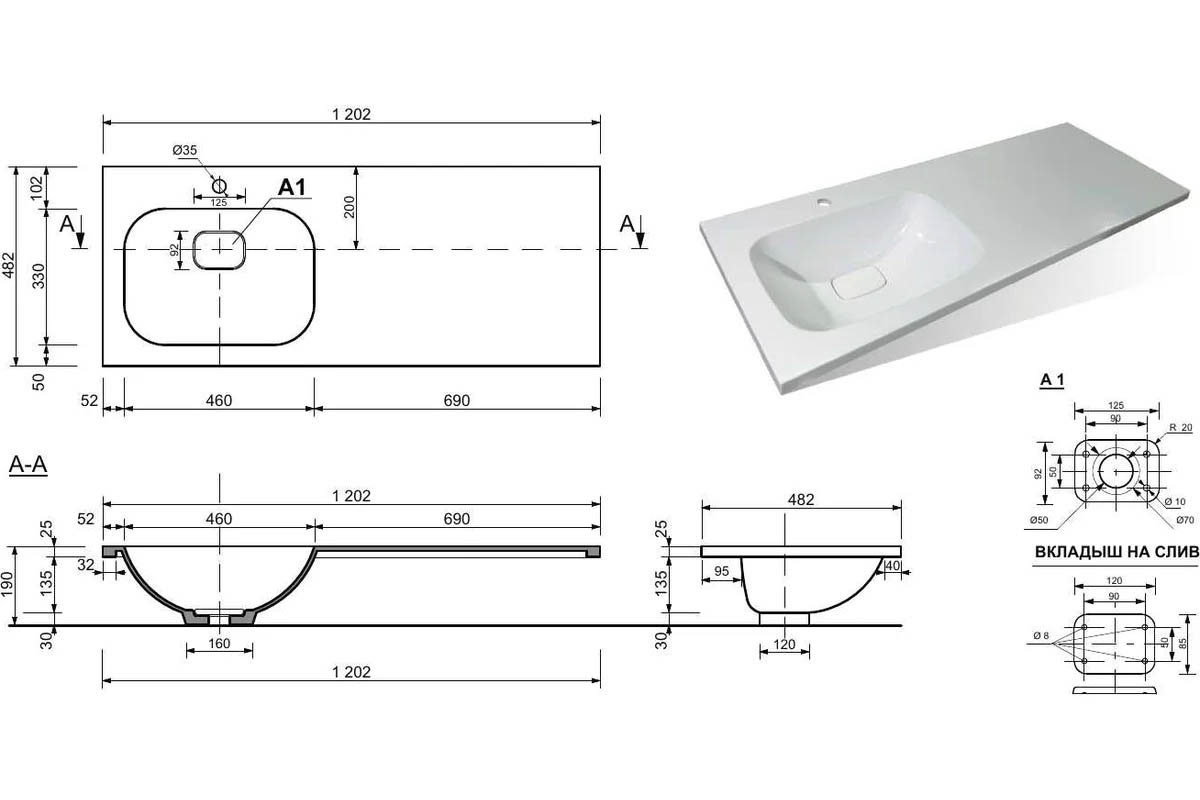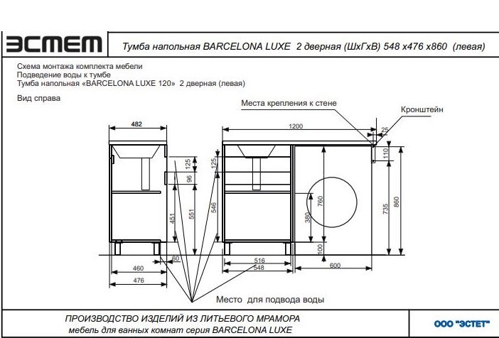 | Раковина | Литьевой мрамор Барселона 120 L/R, кронштейн отдельно |