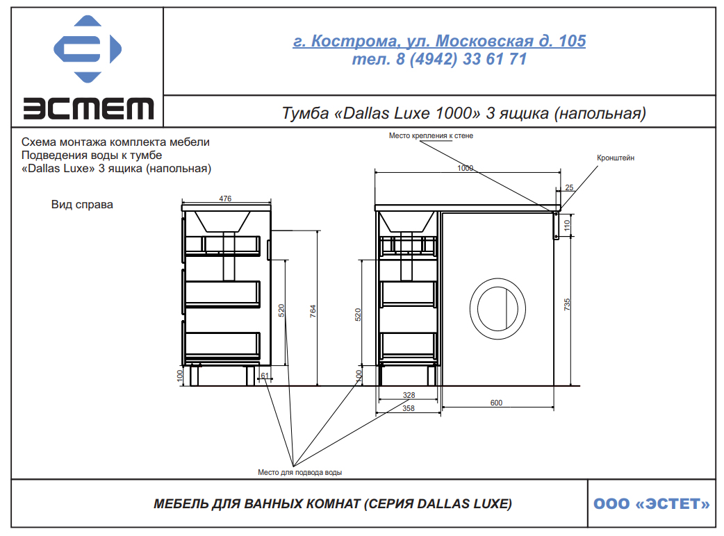 | Раковина | Литьевой мрамор 100 L/R, кронштейн приобретается отдельно |