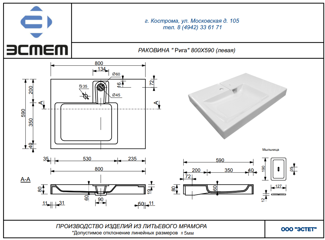 | Раковина | Литьевой мрамор Рига 80 L/R |