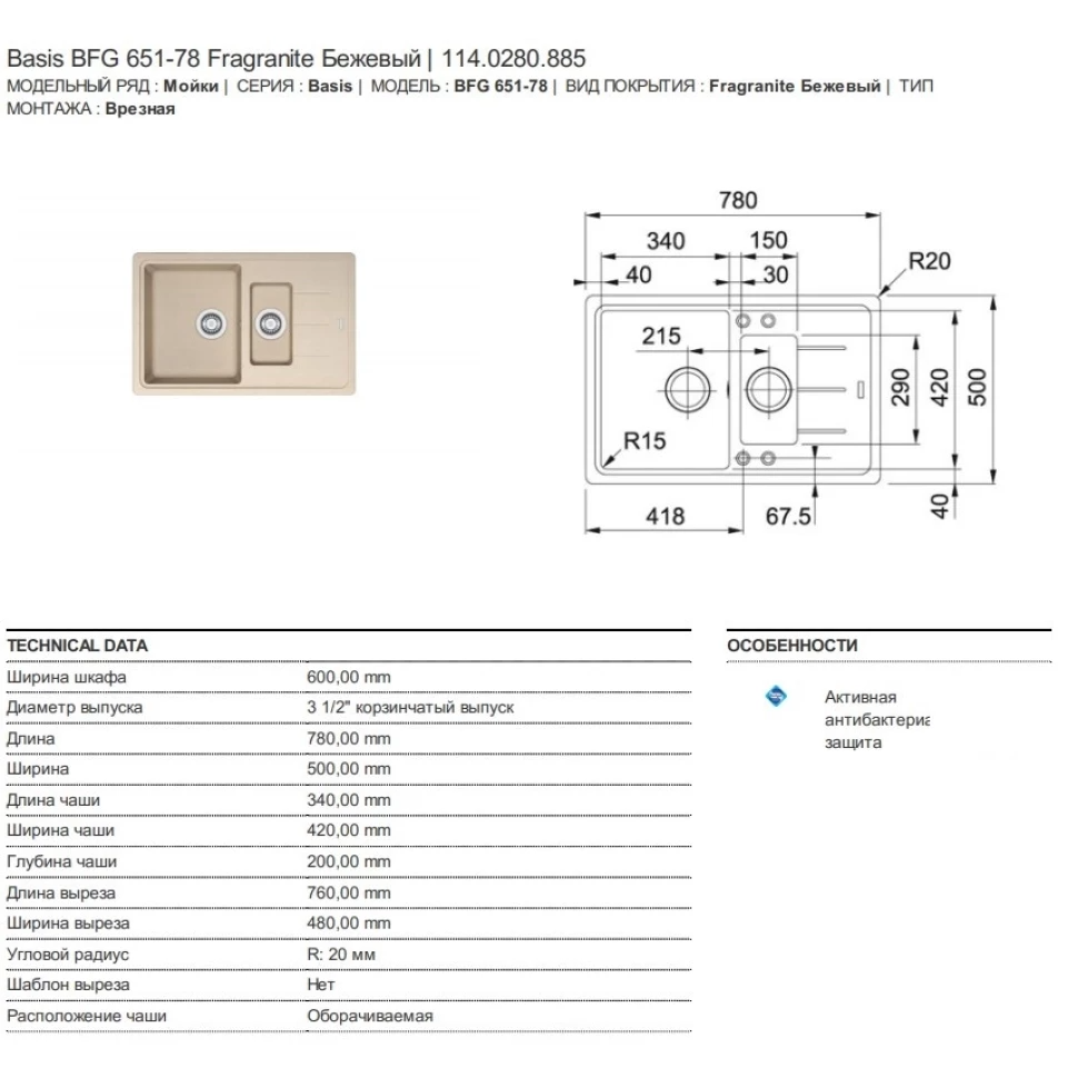 Гранитная мойка Franke Basis BFG 651-78 78х50 см бежевый 114.0280.885