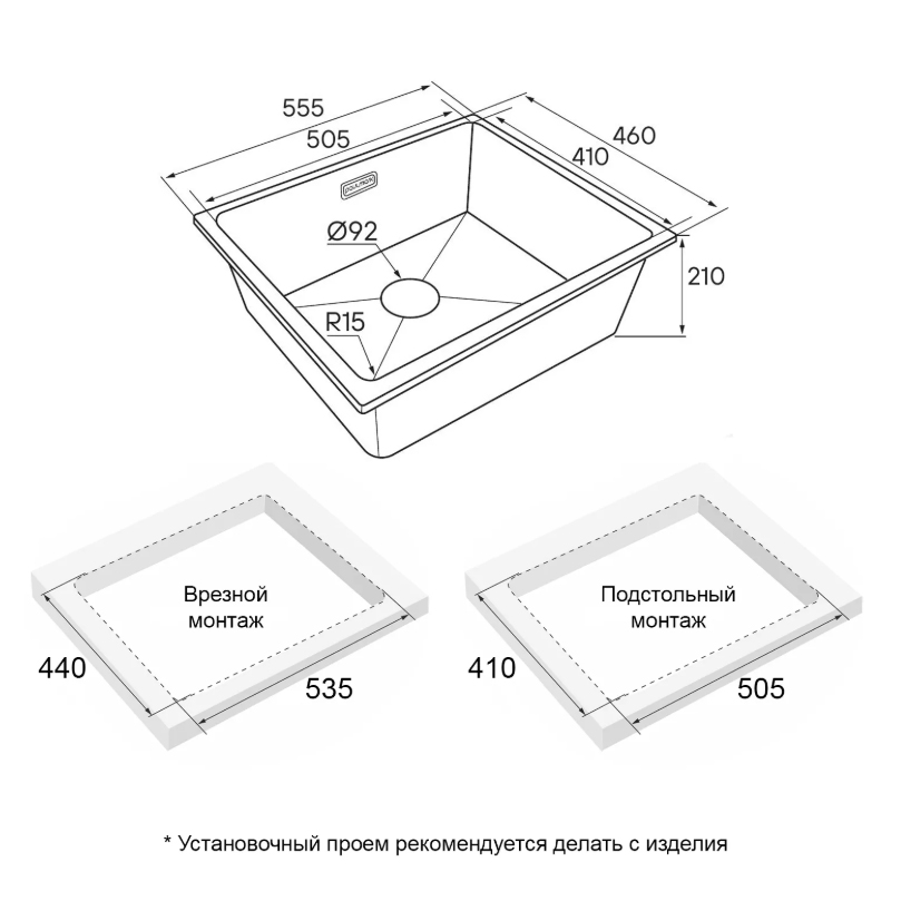 Мойка создана как для современного способа монтажа под столешницу, так и для классического врезного монтажа.