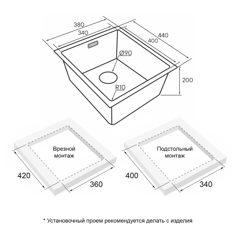 Мойки LASSAN UNI могут быть установлены как врезным способом поверх столешницы, так и под столешницу (подстольный монтаж).