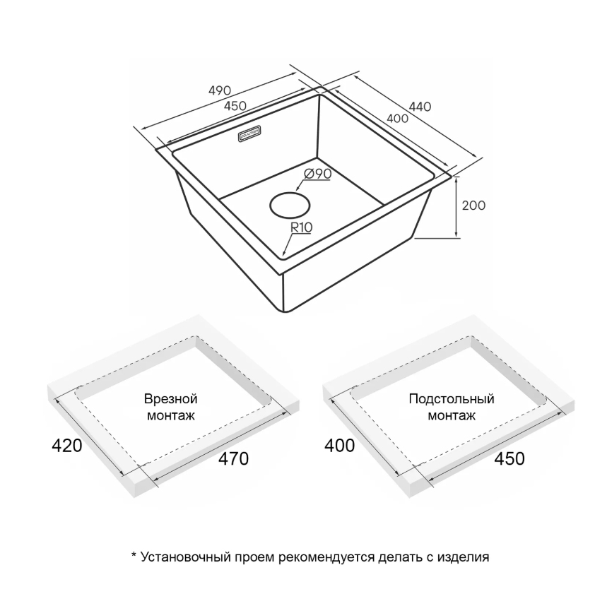 Мойки LASSAN UNI могут быть установлены как врезным способом поверх столешницы, так и под столешницу (подстольный монтаж).