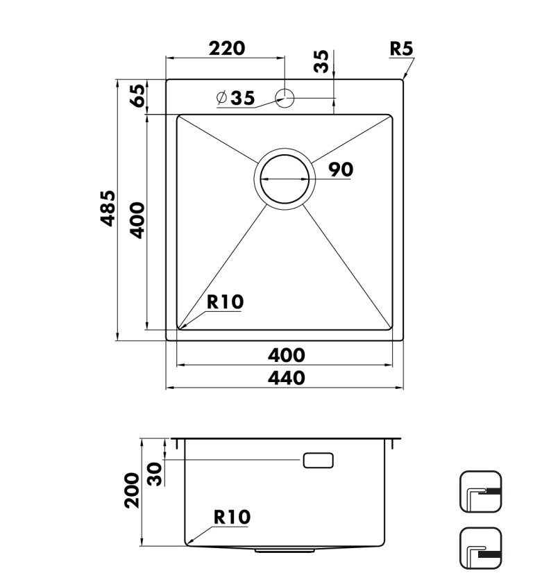 Способ монтажа: вровень со столешницей/ минимальное наложение