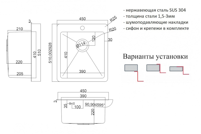 Комплектация: сливная арматура с корзинчатым вентилем 3 1/2, компактный сифон с сухим затвором, декоративная накладка в цвет мойки, комплект креплений, шаблон