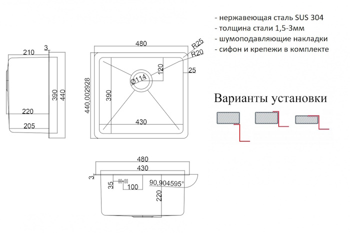 Комплектация: сливная арматура с корзинчатым вентилем 3 1/2, компактный сифон с сухим затвором, декоративная накладка в цвет мойки, комплект креплений, шаблон