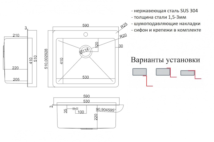 Комплектация: сливная арматура с корзинчатым вентилем 3 1/2, компактный сифон с сухим затвором, декоративная накладка в цвет мойки, комплект креплений, шаблон