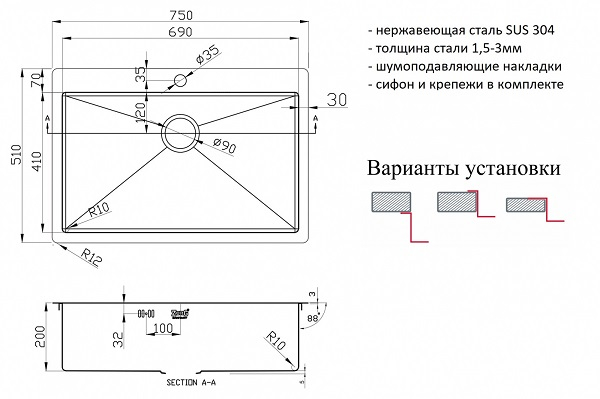 Комплектация: сливная арматура с корзинчатым вентилем 3 1/2, компактный сифон с сухим затвором, декоративная накладка в цвет мойки, комплект креплений, шаблон
