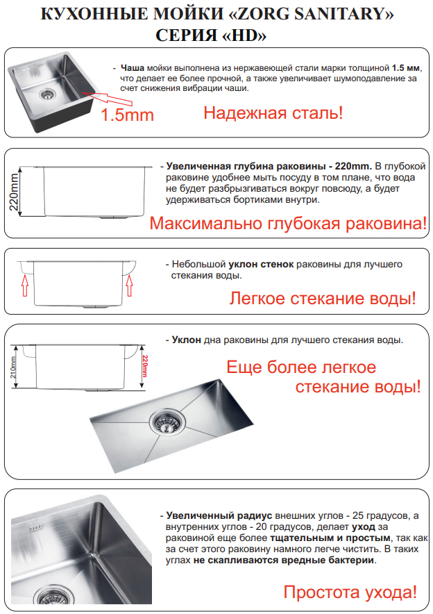 - глубокая вместительная моечная чаша с радиусами скруглений R20 мм