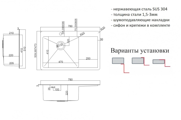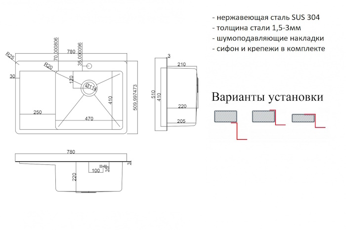 Комплектация: сливная арматура с корзинчатым вентилем 3 1/2, компактный сифон с сухим затвором, декоративная накладка в цвет мойки, комплект креплений, шаблон