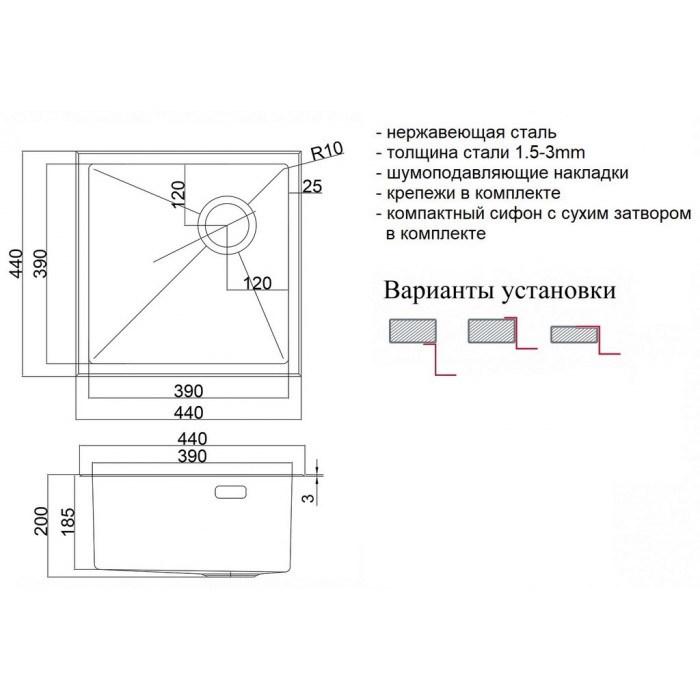 Комплектация: мойка в упаковке, сливная арматура с корзинчатым вентилем 3 1/2, специальный отводной сифон с сухим затвором и возможность подключения стиральной или посудомоечной машины, декоративная накладка на слив, комплект креплений