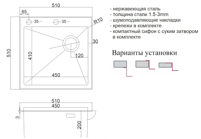 1. Верхний кант мойки выполнен из нержавеющей стали толщиной 3 мм и скосом 45 градусов (фацет), что позволяет мойке идеально прилегать к столешнице и иметь эстетичный внешний вид.