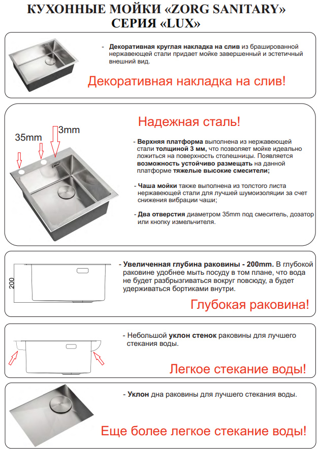 Мойки ZorG Inox LUX выполнены из нержавеющей стали толщина чаши 1,2 мм, верхняя платформа имеет толщину 3мм и скос по 45 градусов по граням бортика для более эргономичного вида при установке на столешницу.