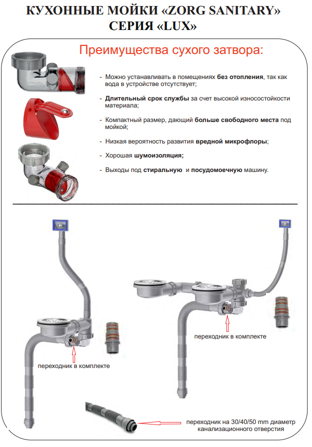 В комплект поставки входит инновационный компактный сифон с сухим затвором и декоративная накладка на слив в цвет мойки.