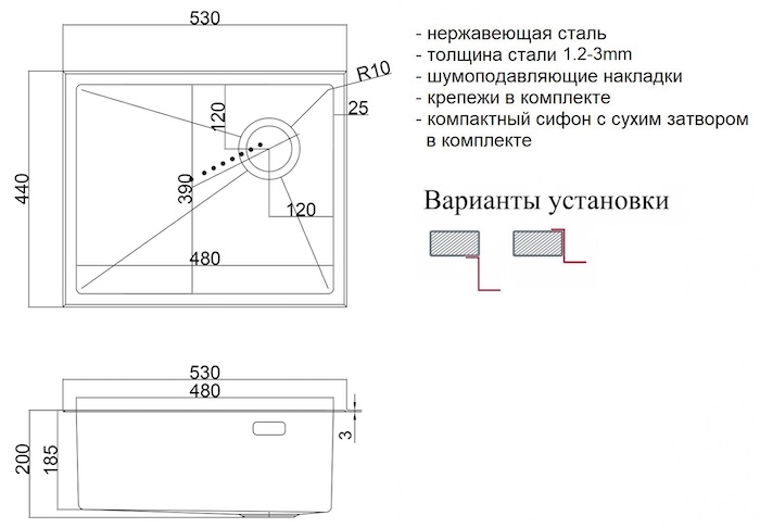 1. Верхний кант мойки выполнен из нержавеющей стали толщиной 3 мм и скосом 45 градусов (фацет), что позволяет мойке идеально прилегать к столешнице и иметь эстетичный внешний вид.