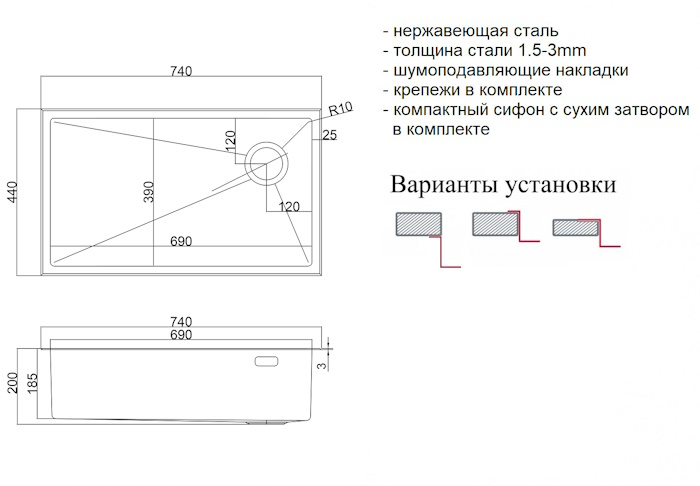 1. Верхний кант мойки выполнен из нержавеющей стали толщиной 3 мм и скосом 45 градусов (фацет), что позволяет мойке идеально прилегать к столешнице и иметь эстетичный внешний вид.