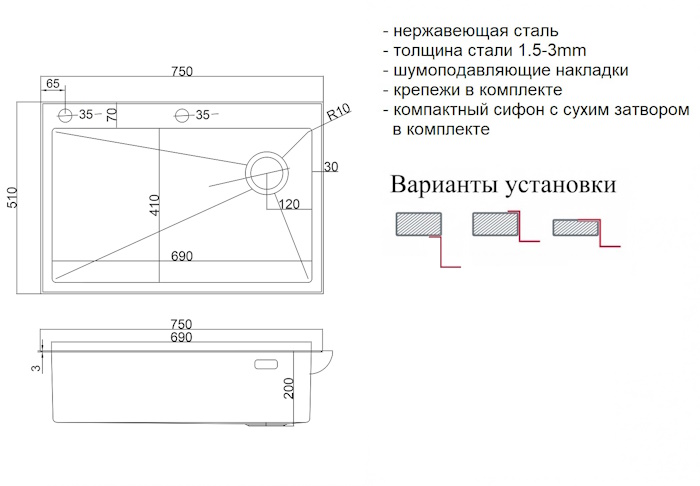 1. Верхний кант мойки выполнен из нержавеющей стали толщиной 3 мм и скосом 45 градусов (фацет), что позволяет мойке идеально прилегать к столешнице и иметь эстетичный внешний вид.