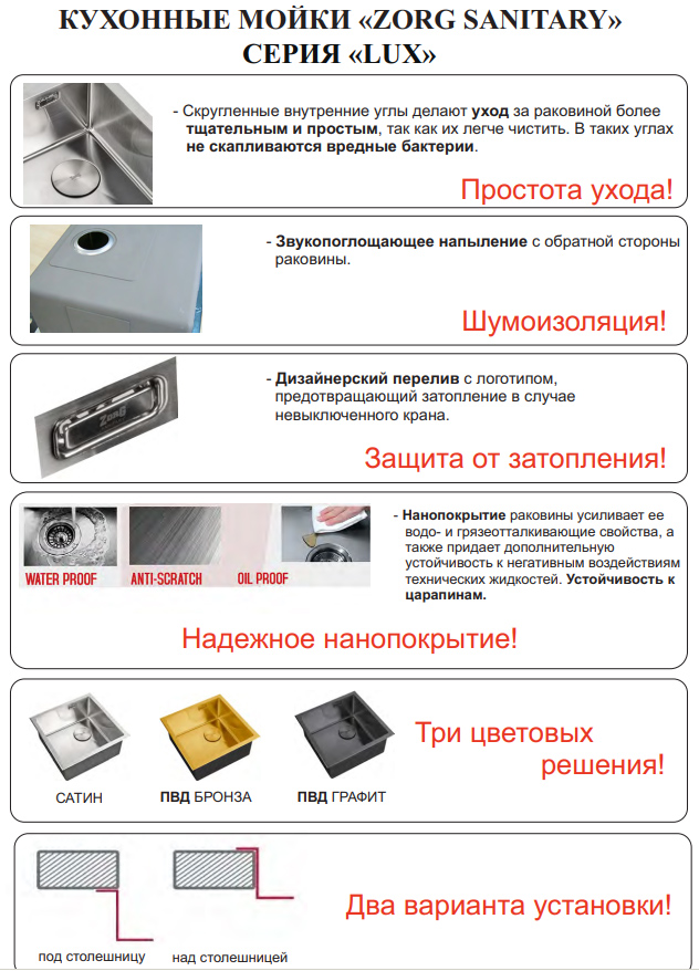 Мойки ZorG Inox LUX выполнены из нержавеющей стали толщина чаши 1,2 мм, верхняя платформа имеет толщину 3мм и скос по 45 градусов по граням бортика для более эргономичного вида при установке на столешницу.