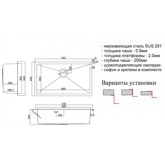 глубокая вместительная моечная чаша 200 мм с радиусами скруглений R10 мм
