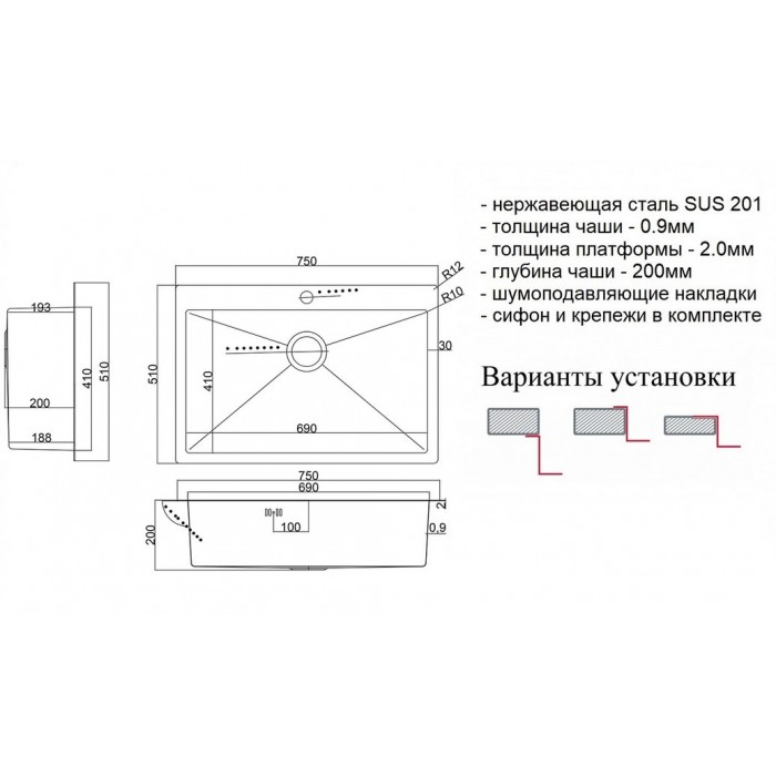 Чаша мойки выполнена из нержавеющей стали толщиной 0.9 мм, а кант (бортик) имеет толщину 2 мм, что позволяет мойке идеально ложиться на поверхность столешницы.