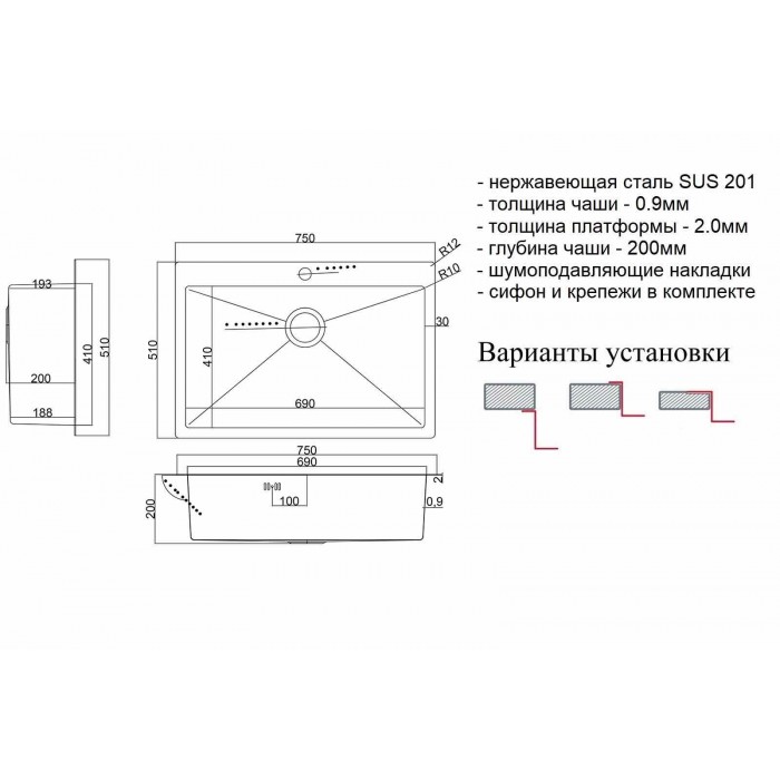 глубокая вместительная моечная чаша 200 мм с радиусами скруглений R10 мм